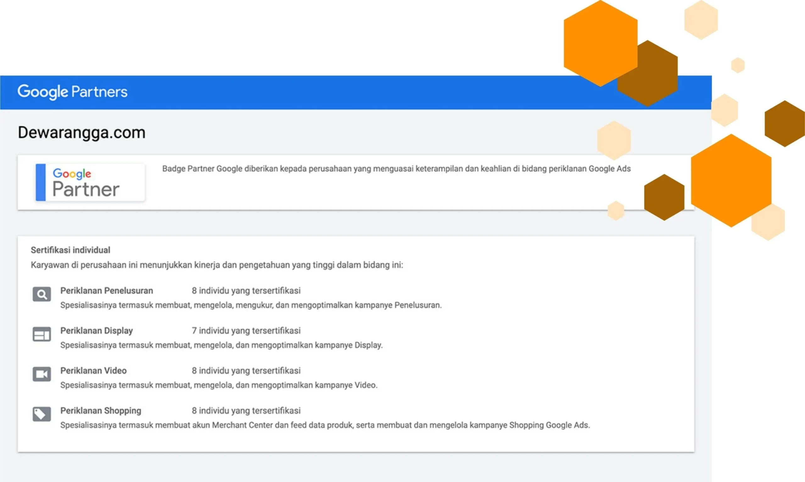 - Status Google Partner Resmi Kami terdaftar sebagai jasa google ads partner. Artinya, kinerja kami diakui langsung oleh Google. Akun Anda dikelola dengan standar kualitas tinggi.